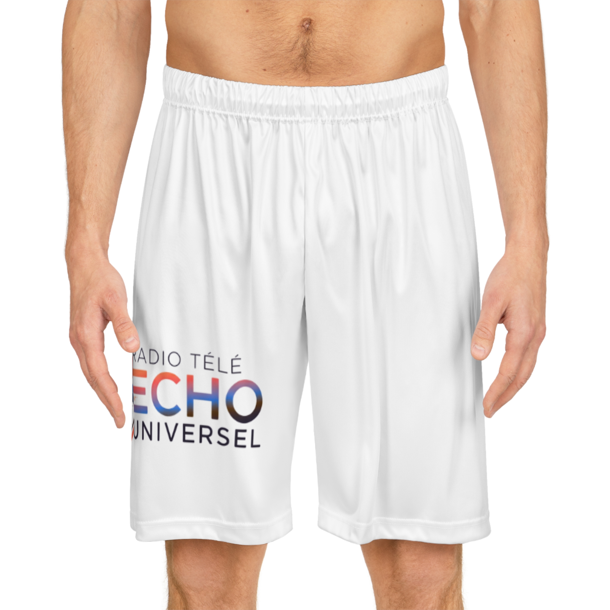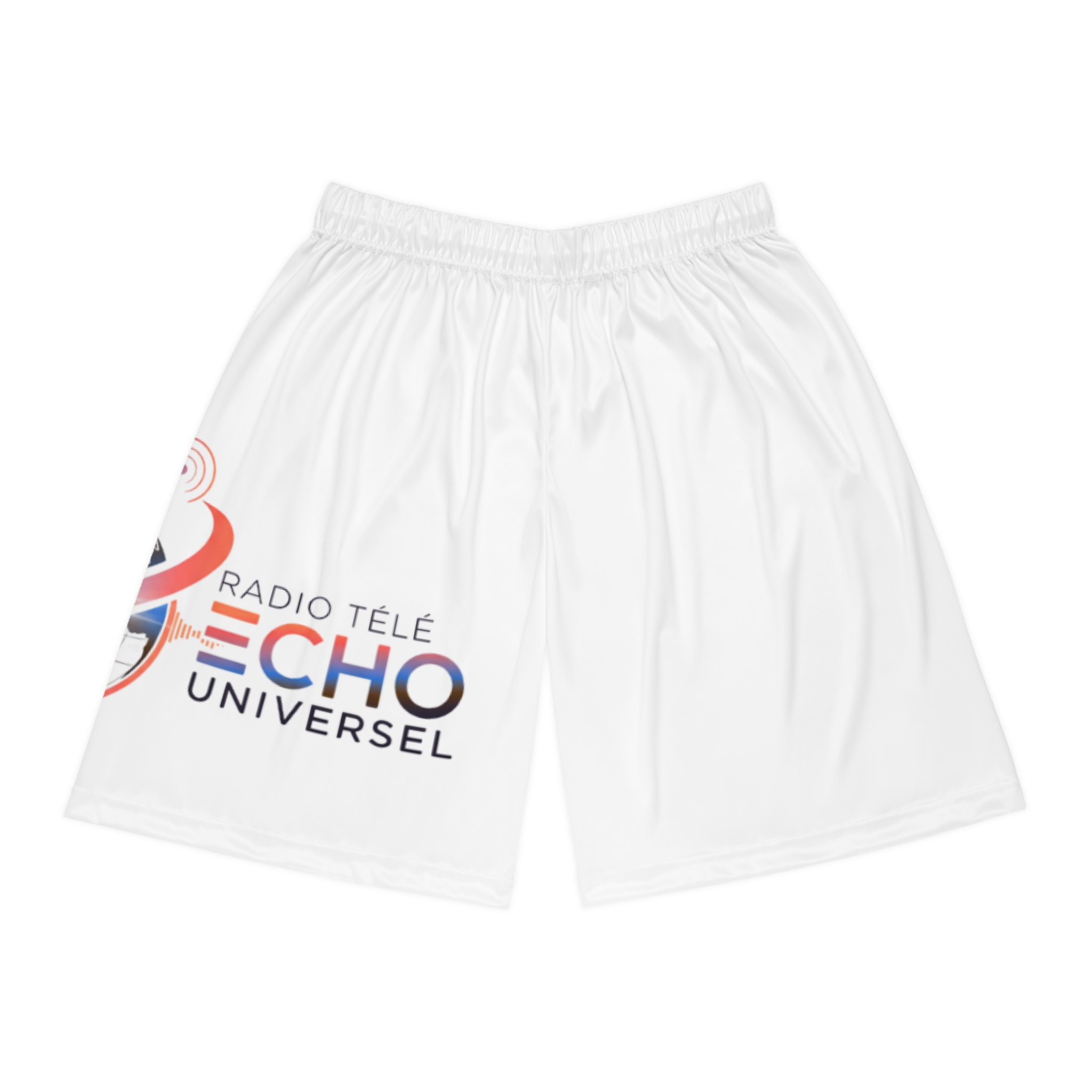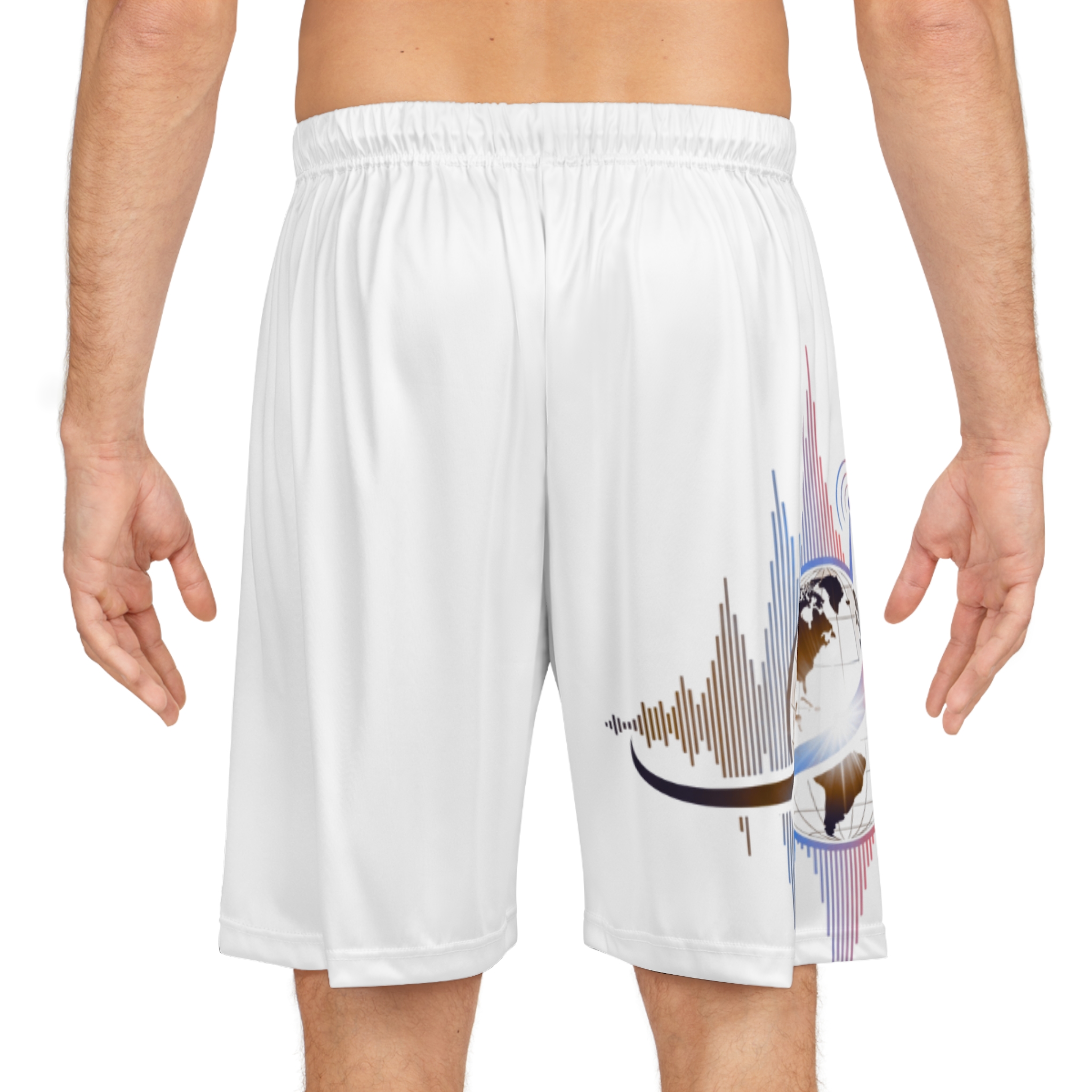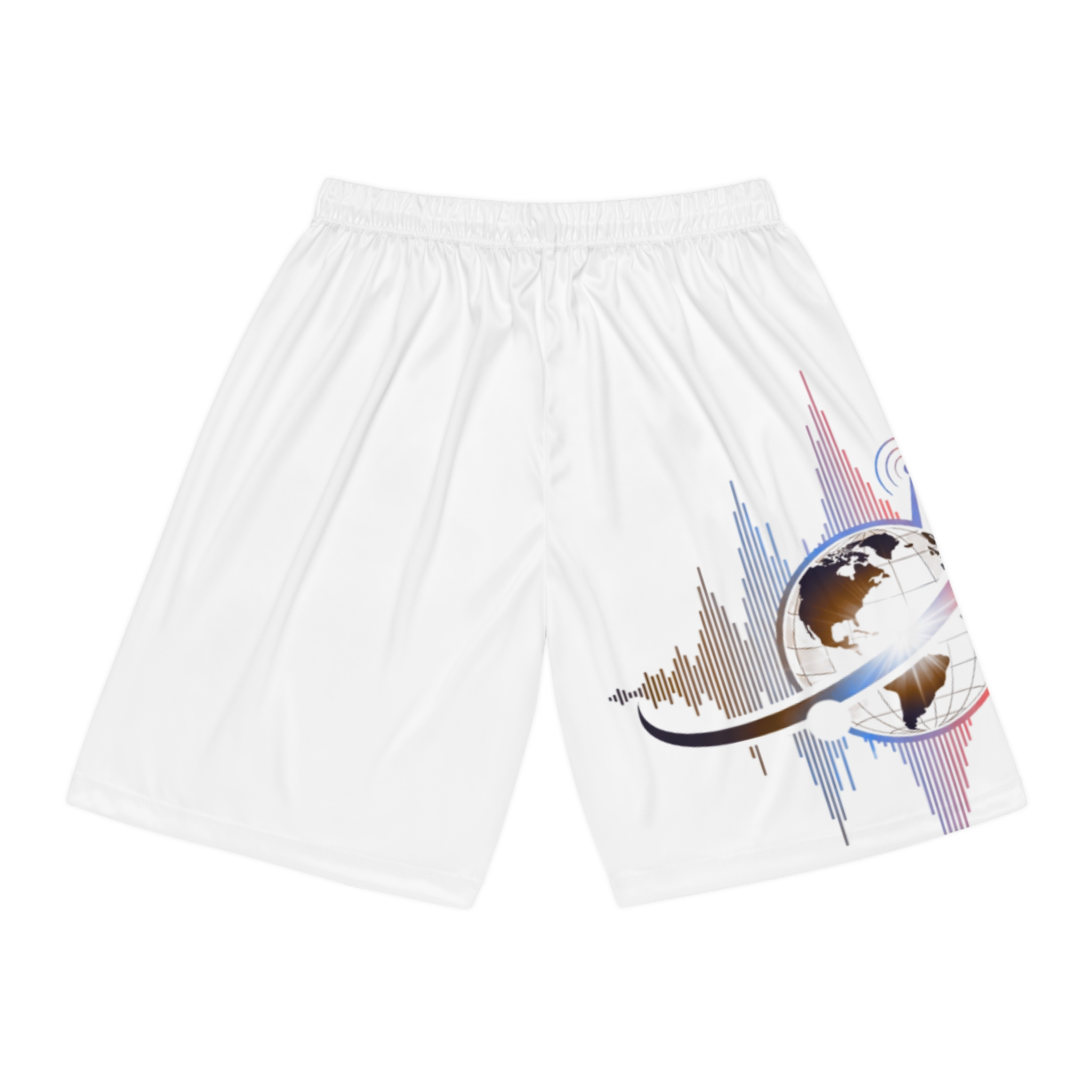Lightweight, breathable basketball shorts built for movement and long days on the court or around town. The ultra-light 100% moisture-wicking polyester keeps sweat away so legs stay cool and dry, while the soft elastic waistband with internal drawstring lets you dial in a secure, comfortable fit. The all-over printed design adds energy and personality — subtle audio-wave and globe graphics peek from the hem for a sporty, media-inspired look. These shorts are simple, functional, and made to move with you: quick-drying fabric, reinforced seams, and a clean no-pocket silhouette for a streamlined feel.